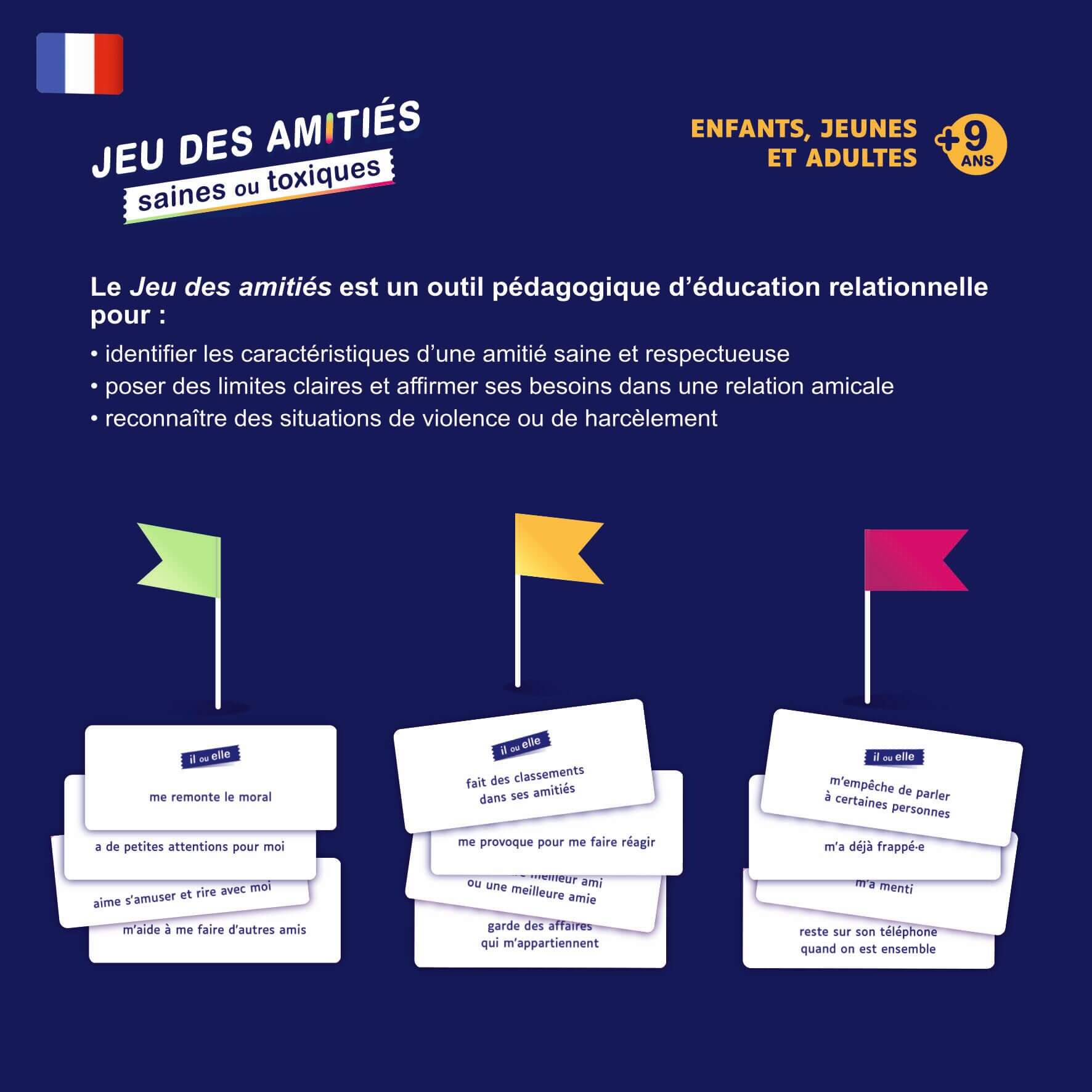 Le Jeu des relations saines ou toxiques est un outil éducatif visant à sensibiliser aux dynamiques relationnelles saines et à prévenir les violences dans les relations amicales. Il permet d’acquérir des compétences en matière de discernement, de prévention du harcèlement , de gestion des conflits, et d’autonomisation dans les décisions relationnelles. Voici un aperçu des mécaniques du jeu et des compétences qu’il développe :