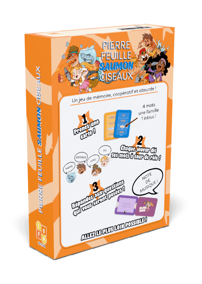 Pierre Feuille Saumon Ciseaux (souvent abrégé PFSC) est un jeu d’ambiance coopératif qui prend tout le monde à contre-pied : derrière son nom volontairement loufoque, il propose une expérience de groupe où l’on rit… tout en se surprenant à transpirer du cerveau. L’objectif est simple à dire et délicieusement difficile à tenir : coopérer, mémoriser, répondre juste… et aller le plus loin possible avant de “se perdre”.