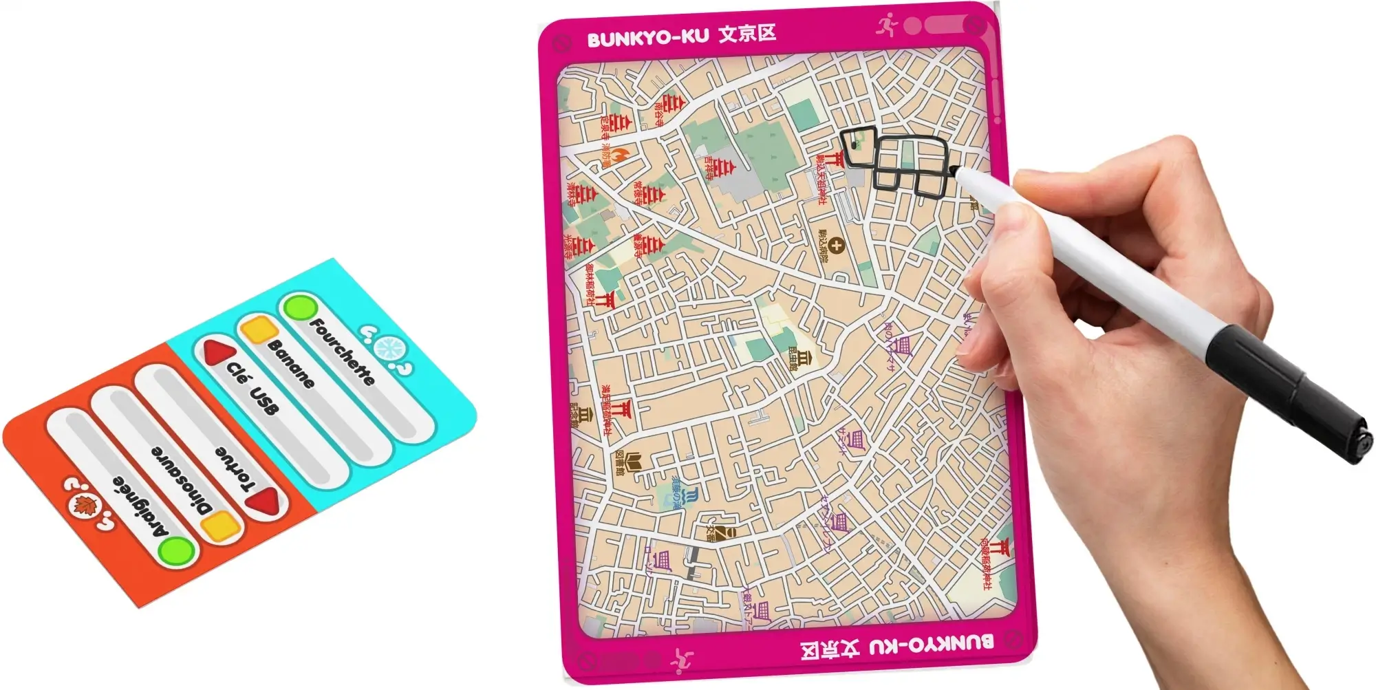 Un jeu de dessin coopératif qui transforme un plan de ville en terrain de communication pure. Avec Streets of Tokyo, le dessin devient une course, la carte devient un langage, et chaque trait compte. Le principe est aussi simple qu’original : faire deviner des mots en les dessinant directement sur le plan de Tokyo, en suivant les rues et les contraintes du quartier traversé. Résultat : un jeu d’ambiance coopératif étonnamment singulier, où l’on rit, on observe, on interprète, et surtout on tente de rester ensemble dans le tempo du chronomètre. Le jeu est présenté comme un coopératif de dessin dans lequel il faut compléter les 23 quartiers avant la fin du temps imparti.