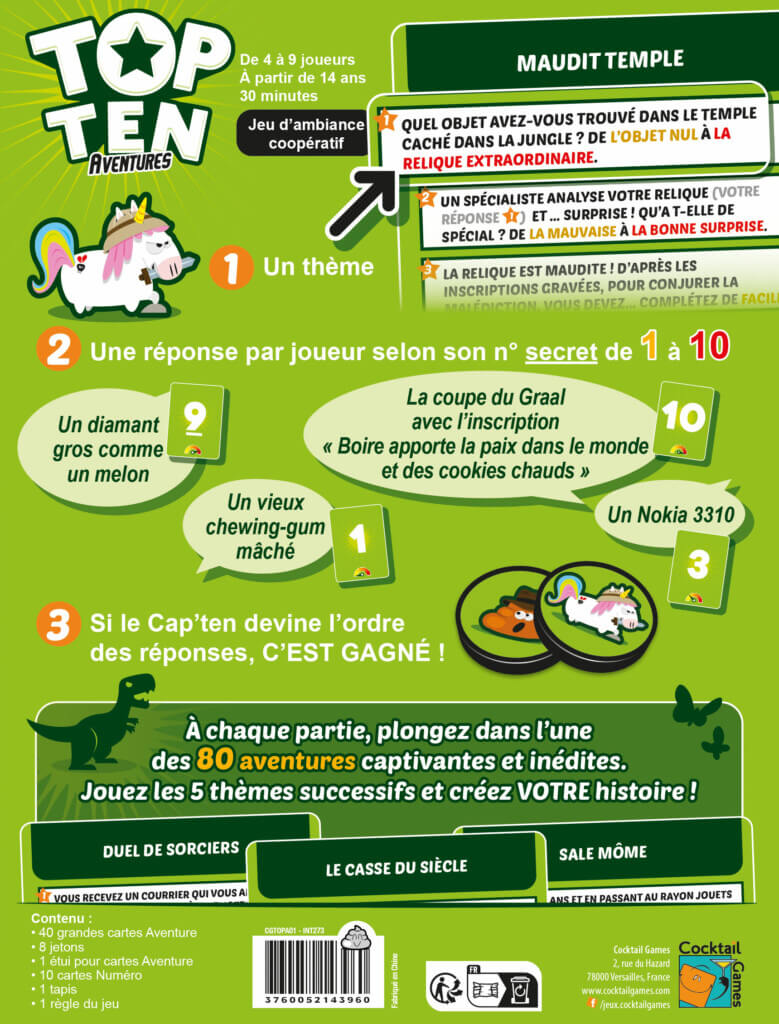 Plus accessible que la version 18+, plus narrative que la version classique, Top Ten Aventures s’impose comme le chaînon manquant entre le jeu d’ambiance et le jeu de rôle coopératif.